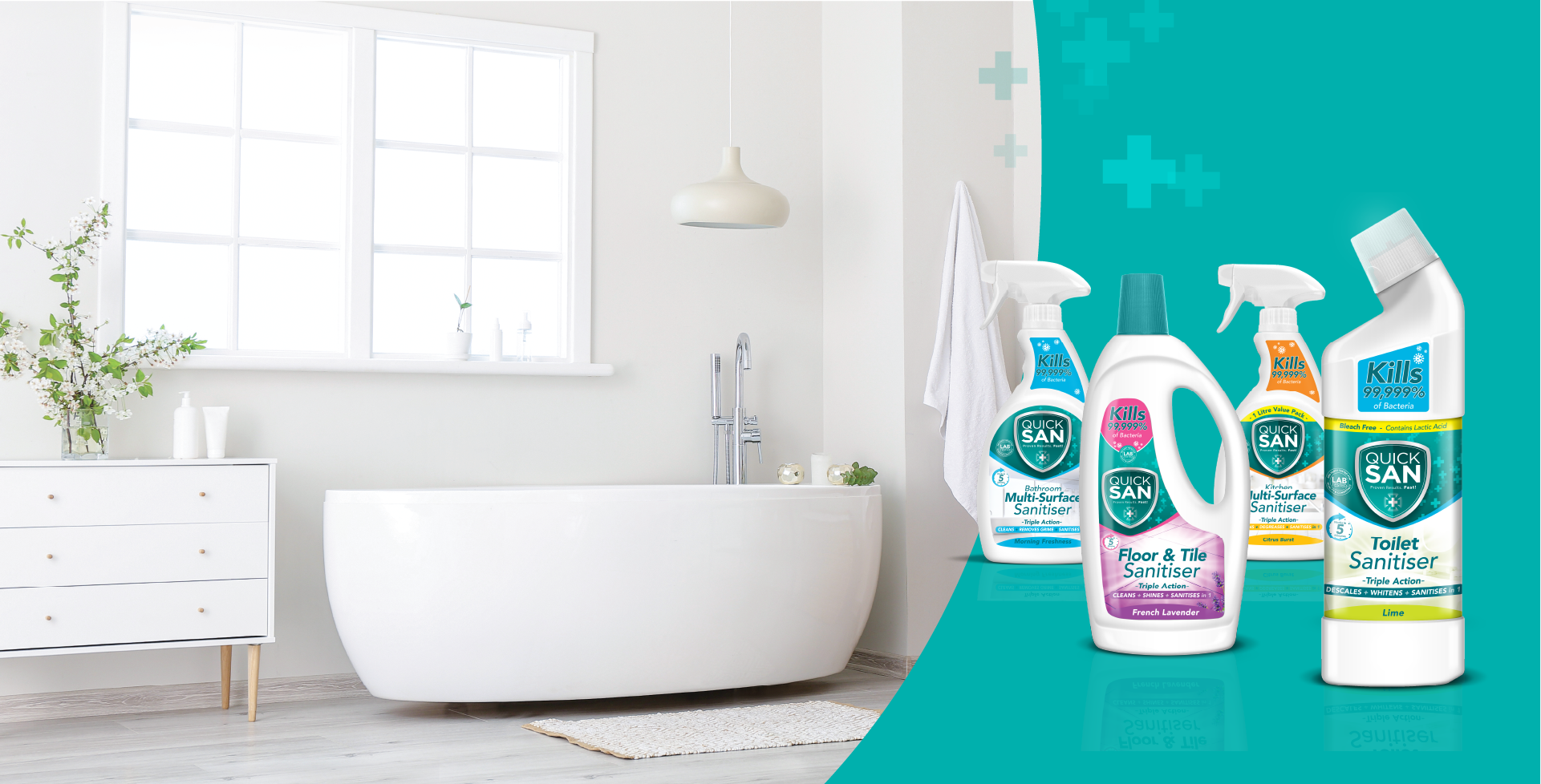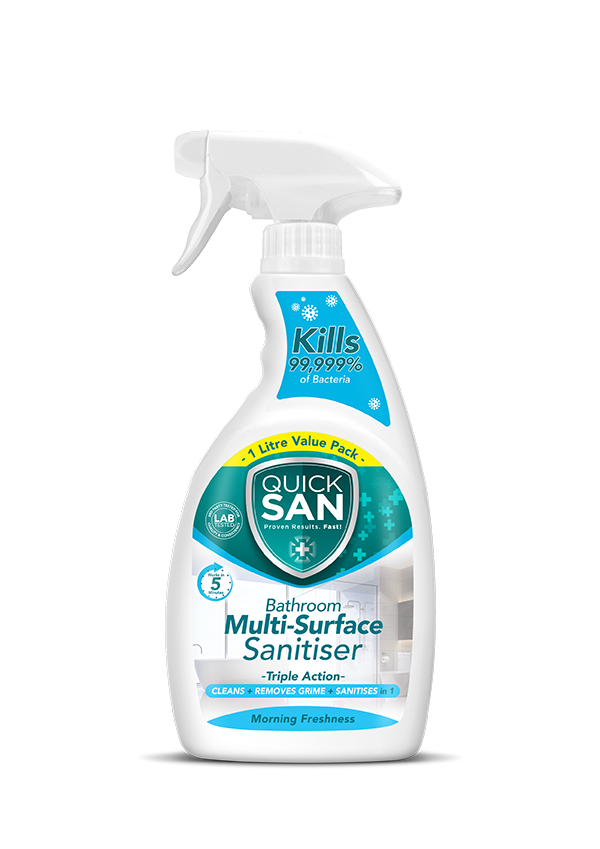 QuickSan Bathroom Multi-Surface Sanitiser is a cleaner, sanitiser and grime remover for use on bathroom surfaces such as bathroom tiles, bathtubs, basins, and shower doors.